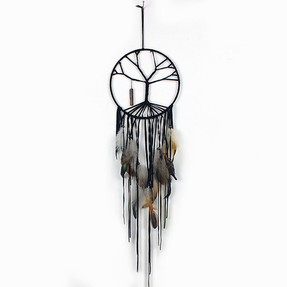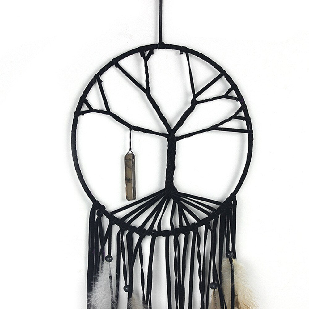 Denna jordnära drömfångare med Livets Träd i centrum bär på en stark och stillsam energi. Med svart tråd, bruna och svarta fjädrar samt en infälld sten i ringen, skapas ett uttryck av beskydd, rötter och inre stabilitet